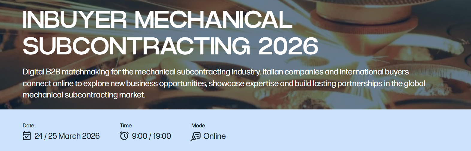 Digital B2B matchmaking for the mechanical subcontracting industry. Italian companies and international buyers connect online to explore new business opportunities, showcase expertise and build lasting partnerships in the global mechanical subcontracting market.